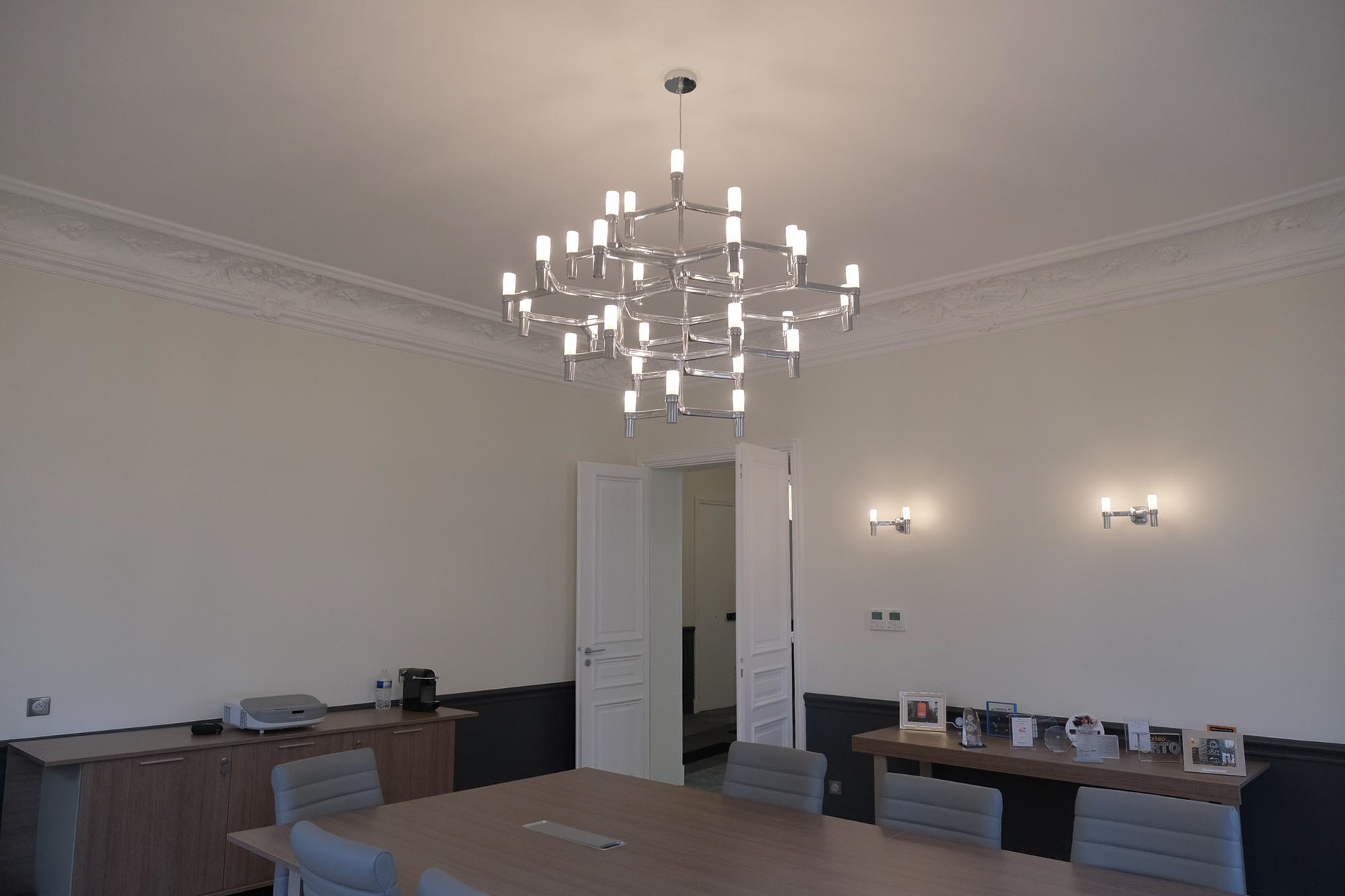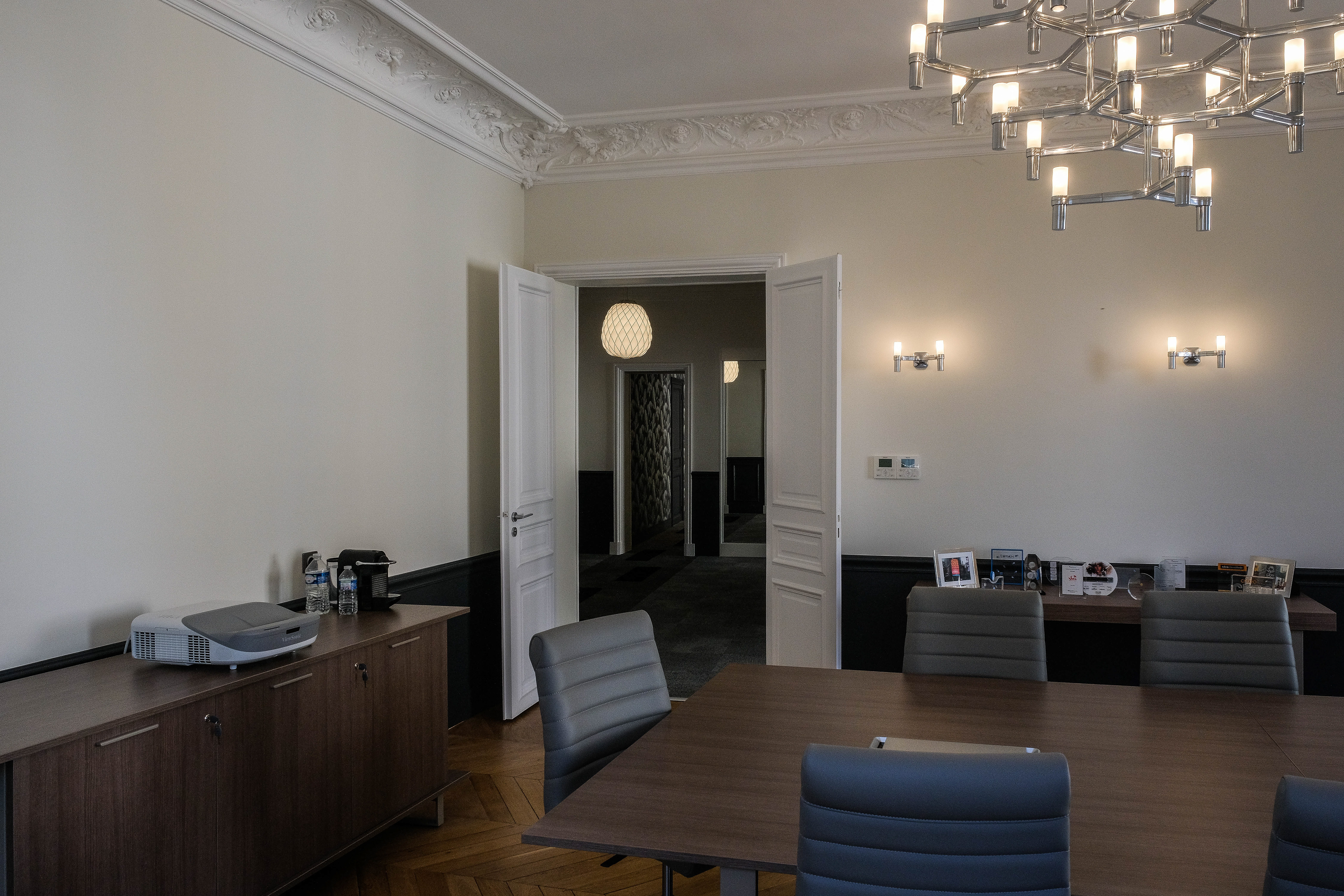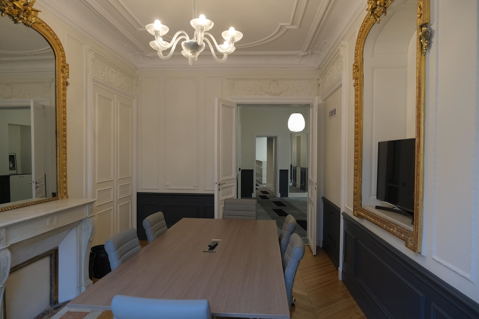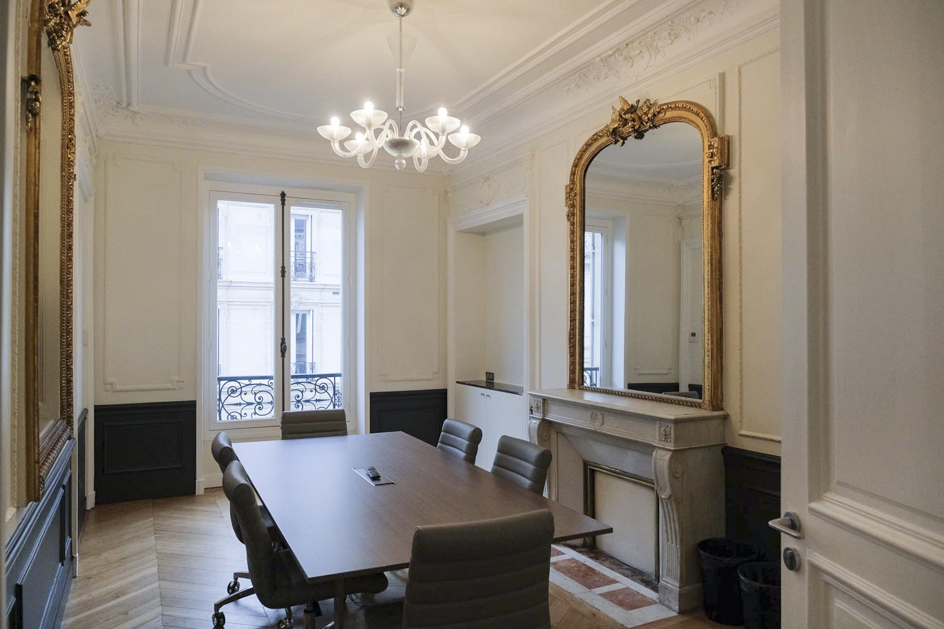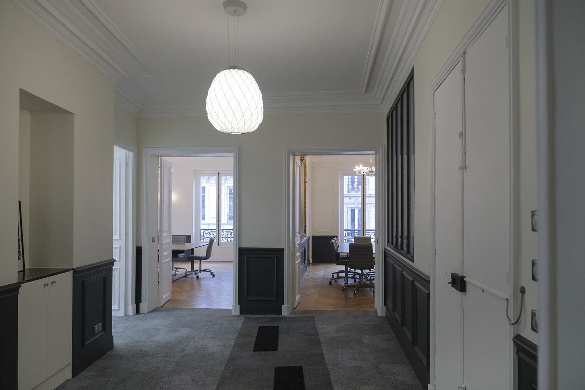 Transformation d'un appartement haussmannien en bureaux paysagés et salles de réunions. Intégration de la climatisation, confort acoustique optimal, décoration.